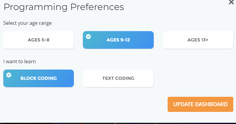 Update the settings shown here, then click UPDATE DASHBOARD. Text coding refers to languages for older learners, such as Python and JavaScript. Update your preferences at any time!