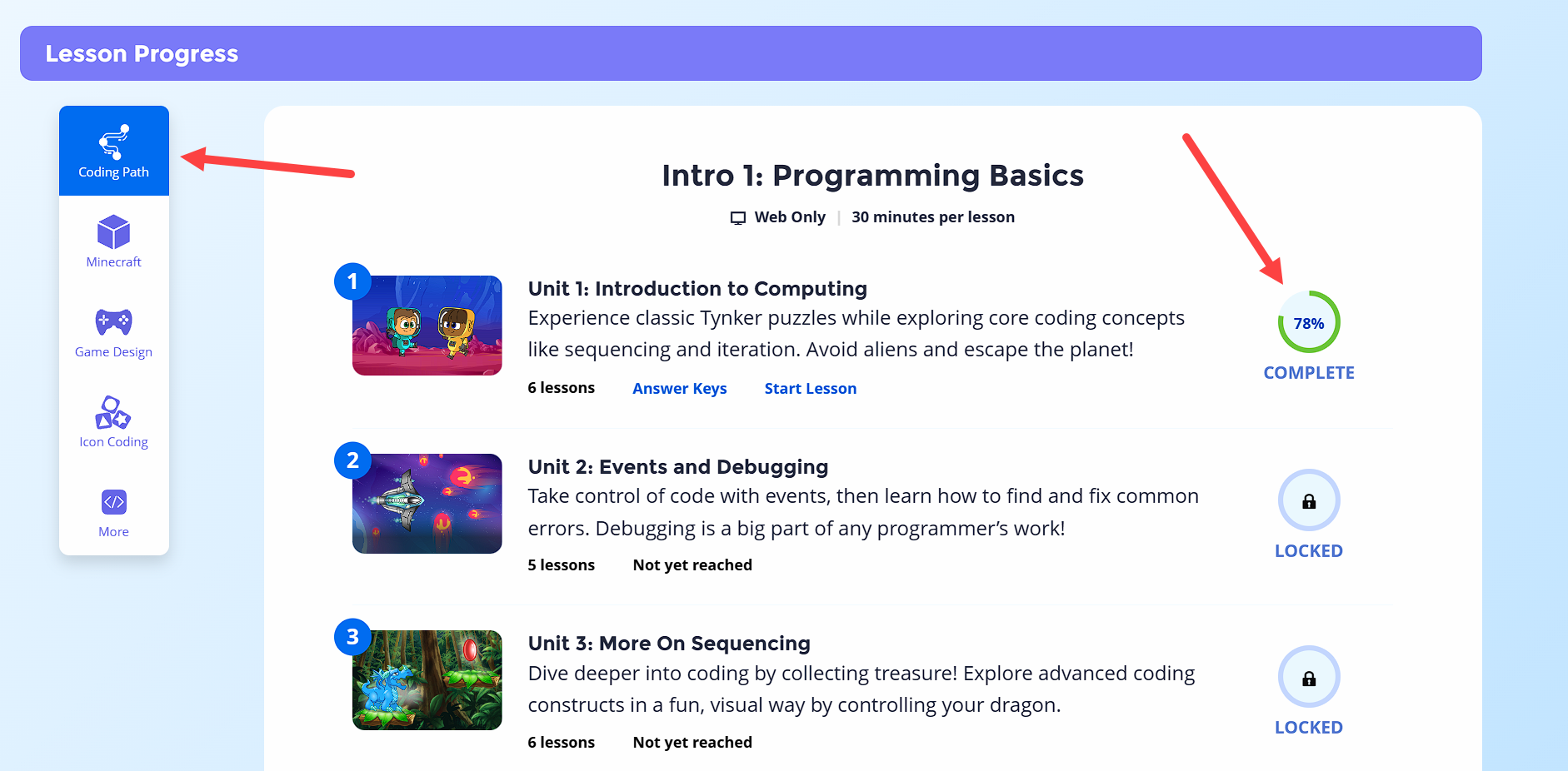 Scroll down further to see Lesson Progress. Use the left navigation to switch between course categories: